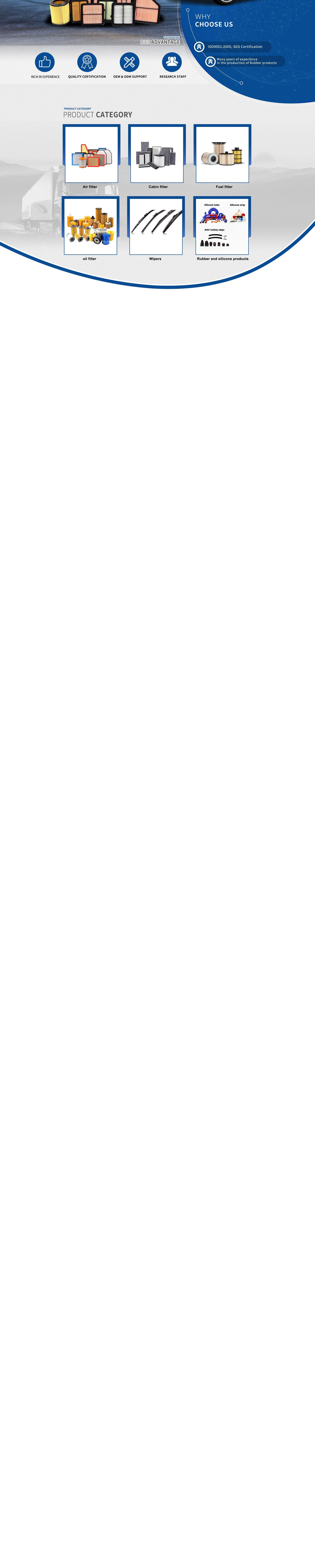 Productos principales:Filtro de aire, Filtro de cabina, Filtro de aceite, Limpiaparabrisas, Productos de goma